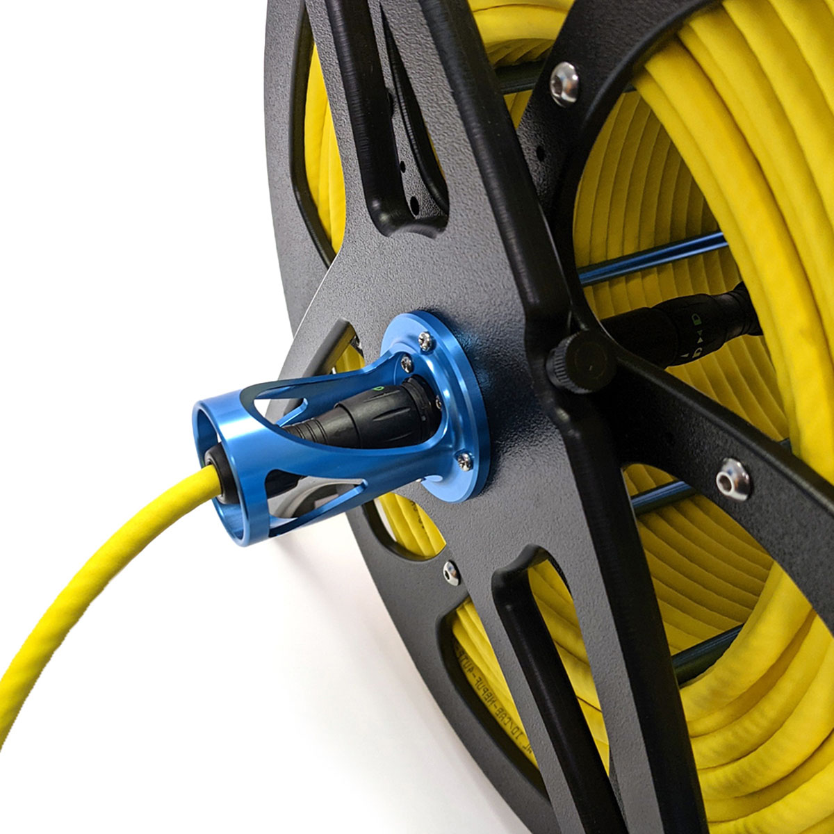 The Fathom Spool comes as a partially-assembled kit with some simple assembly required. It has a Binder 770 connector on both the inside and outside of the spool so that to install the tether, you just plug it into the inner Binder 770 connector, attach a few restraints, and start spooling! An included 8 meter (26 ft) extension cable provides a connection from the outer connector on the spool to your FXTI and computer.
