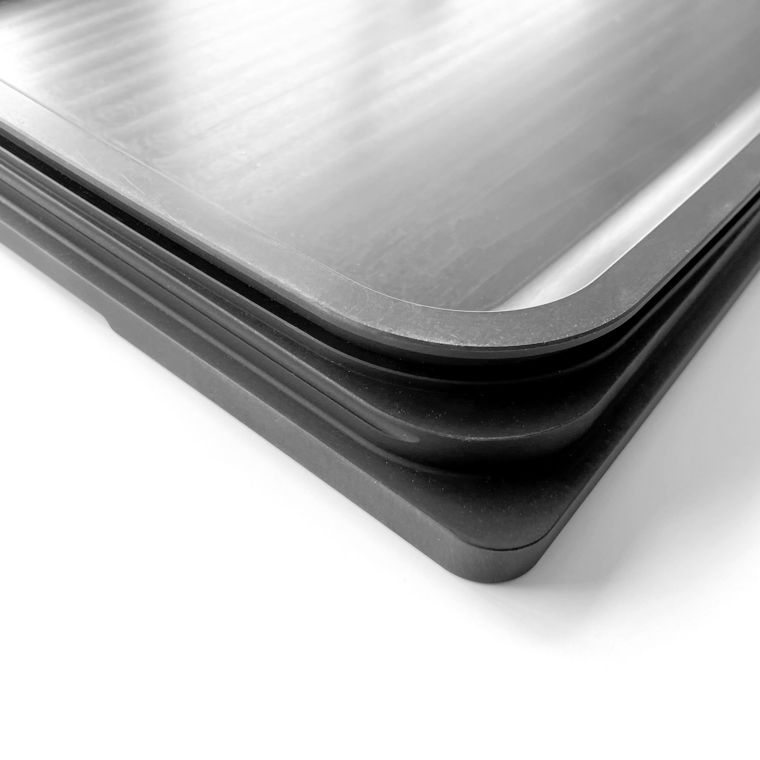 These boxes are available in two different sizes for different applications. Each of them consists of a box and lid made from anodized 6061-T6 aluminum. The lid seals to the box with a radial O-ring and is held in place using a plastic locking cord, like our cylindrical enclosures. That means there are no screws and the box can be opened and closed in just a few seconds!
